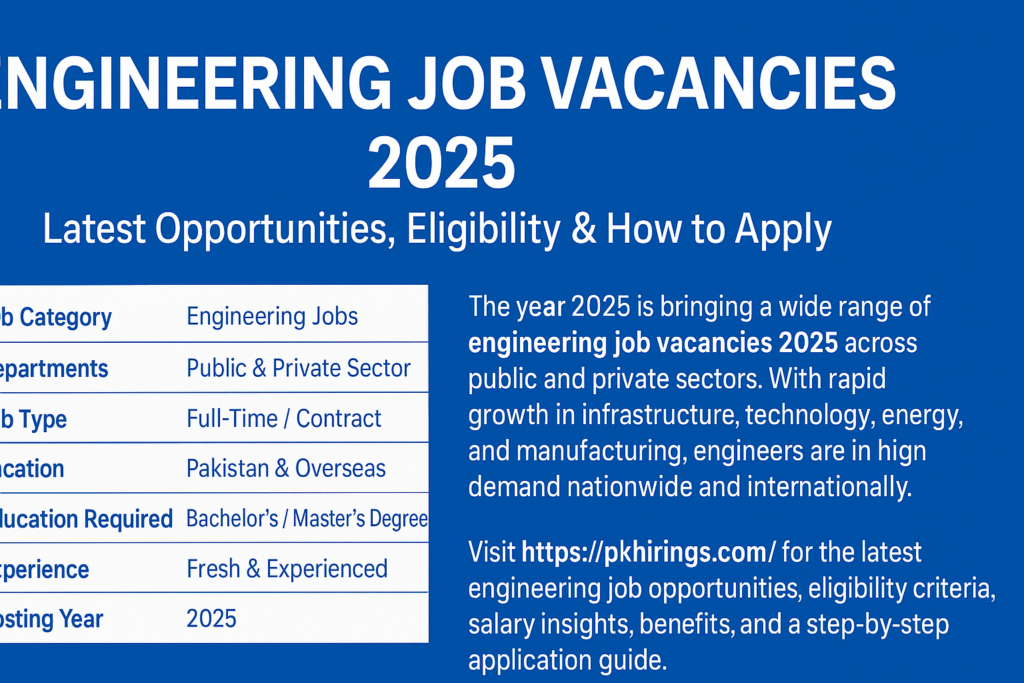 Yahan aap ko latest engineering jobs, verified government & private sector vacancies, eligibility updates, aur daily job alerts milte rahain ge. Aaj hi apply karein aur 2025 mein apni engineering career ko next level par le jayein before deadlines close!